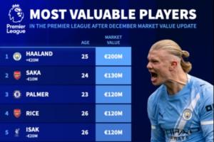 体育资讯12月09日讯 今日德转更新新一期英超球员身价,哈兰德2亿居首,伊萨克降至1.2亿,维尔茨降至1.1亿。