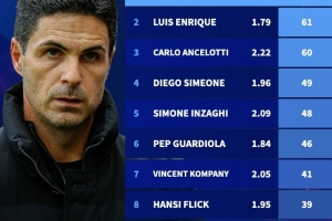 体育资讯12月11日讯 在本轮欧冠,阿森纳3-0大胜布鲁日,豪取6连胜。德转也盘点了自阿尔特塔执教阿森纳欧冠首秀以来,各位主帅在欧冠同期积分榜(包括淘汰赛),具体如下(场均积分+总积分):