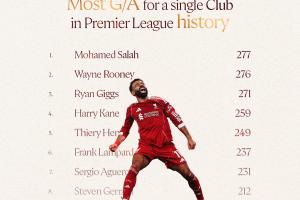 萨拉赫英超中为利物浦直接参与277球(188球,89助),超越鲁尼成英超历史中为单一俱乐部直接参与进球最多的球员。