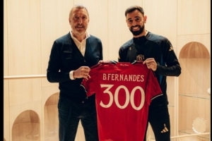 曼联官推也晒出了B费被赠送印有300字样的纪念球衣的照片,并配文:“B费将在周六迎来他在曼联的第300场比赛。”