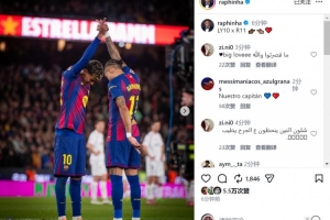 拉菲尼亚赛后更新社媒动态,晒出与亚马尔庆祝进球的合照,配文:“LY10 x R11👉🏾👈🏽❤️”