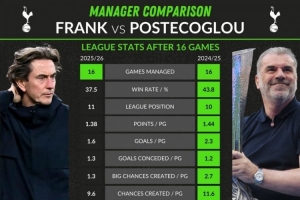 体育资讯12月15日讯 热刺在本赛季英超高开低走,whoscored也对比了新帅弗兰克本赛季前16轮和前任澳波上赛季前16轮的关键数据,弗兰克完败。