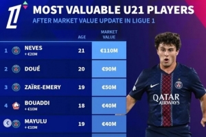 体育资讯12月15日讯 德转更新了法甲球员身价情况,并列出了U21最贵身价榜,内维斯压杜埃居首。