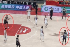 姜伟泽示意压时间,摩尔指篮下要球的曾繁日 姜伟泽突然传球给曾繁日扣空篮