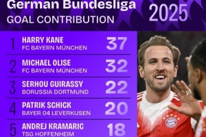 体育资讯12月30日讯 2025年即将结束,squawka也统计了本年度德甲直接参与进球榜,凯恩和奥利塞均参与了至少30球。