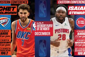 体育资讯01月03日讯 NBA官方宣布,活塞斯图尔特与雷霆霍姆格伦分别当选12月东西部月最佳防守球员。