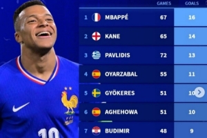 1、姆巴佩 67场16球
