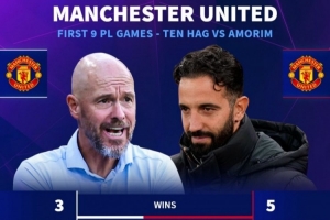 24-25赛季,滕哈赫带队:前9轮3胜2平4负,积11分,场均1.22分,联赛第14位