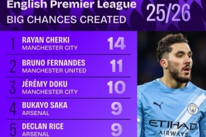 本赛季英超创造重大机会榜:
