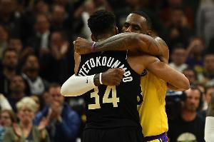 据湖人记者Mark Medina报道,赛后詹姆斯送给字母哥一件湖人23号签名秋衣,字母哥兴奋向队友炫耀,甚至直接穿上了。