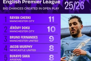 体育资讯1月13日讯 数据机构squawka统计了本赛季英超运动战创造重大机会情况,谢尔基力压多库居首。