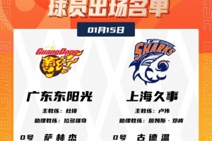 体育资讯1月15日讯 今晚19:35,广东将在主场迎战上海,赛前大名单出炉。