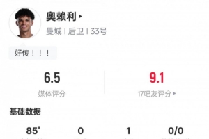 体育资讯10月18日讯 2025-26赛季英超联赛第8轮,曼城对阵埃弗顿。奥赖利首发出战,送出1次助攻,1次关键传球,还有3解围2抢断,评分6.5。