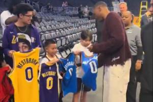 球迷上传的完整版视频里,威少确实没有给湖人球衣签名,但他把自己的腕带送给了手持湖人球衣的小球迷。