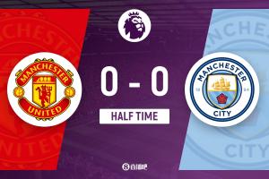 上半场比赛结束,曼联0-0曼城。