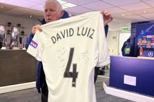 切尔西旧将大卫·路易斯随帕福斯重返斯坦福桥,此役担任替补没有出场,他与切尔西球迷合影,并将自己的签名球衣赠送给切尔西老员工普尔曼。